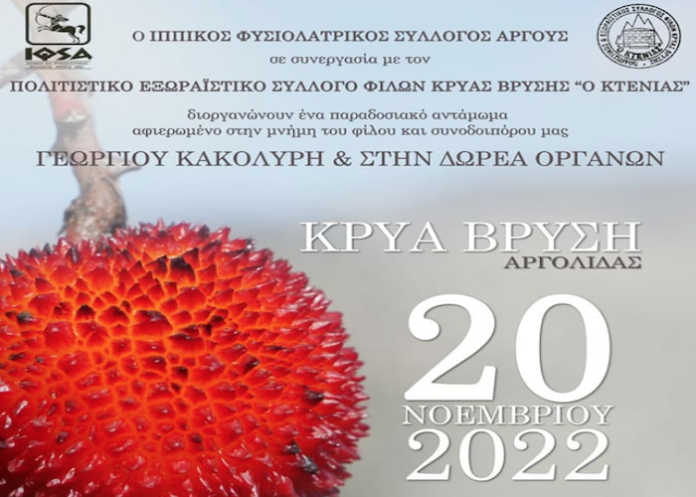 Ο Ιππικός Φυσιολατρικός Σύλλογος Άργους σε συνεργασία με τον Πολιτιστικό Εξωραϊστικό Σύλλογο Φίλων Κρύας Βρύσης ‘Ο ΚΤΕΝΙΑΣ’ σας προσκαλούν στην εκδήλωση που θα πραγματοποιήσουν την Κυριακή 20 Νοεμβρίου 2022 στα μονοπάτια του όρους Κτενιά στα όρια των νομών Αργολίδας και Αρκαδίας.